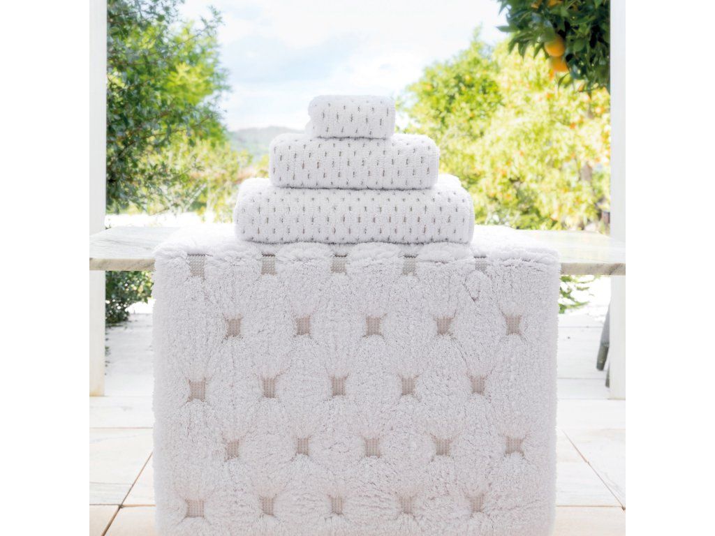 Alice od Graccioza – luxusní ručníky z egyptské bavlny 85%,10%vizkózi a 5%Lnu  s gramáží 680 GSM, která přinášejí výjimečnou měkkost, savost a dlouhotrvající svěžest. Precizní zpracování a nadčasový design dělají z každé koupelny prostor skutečného hotelového komfortu.